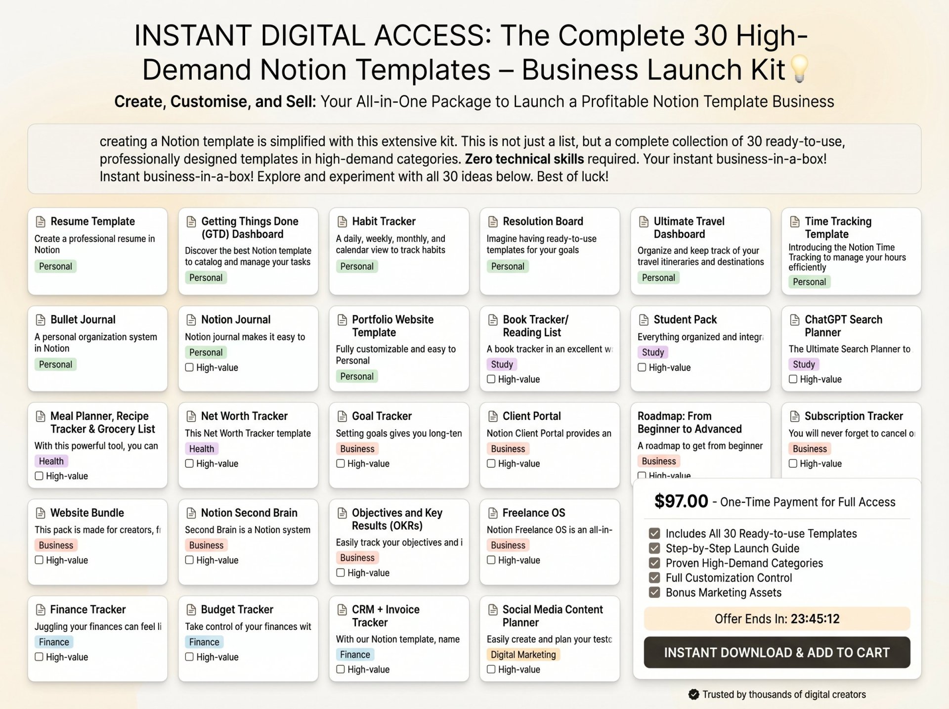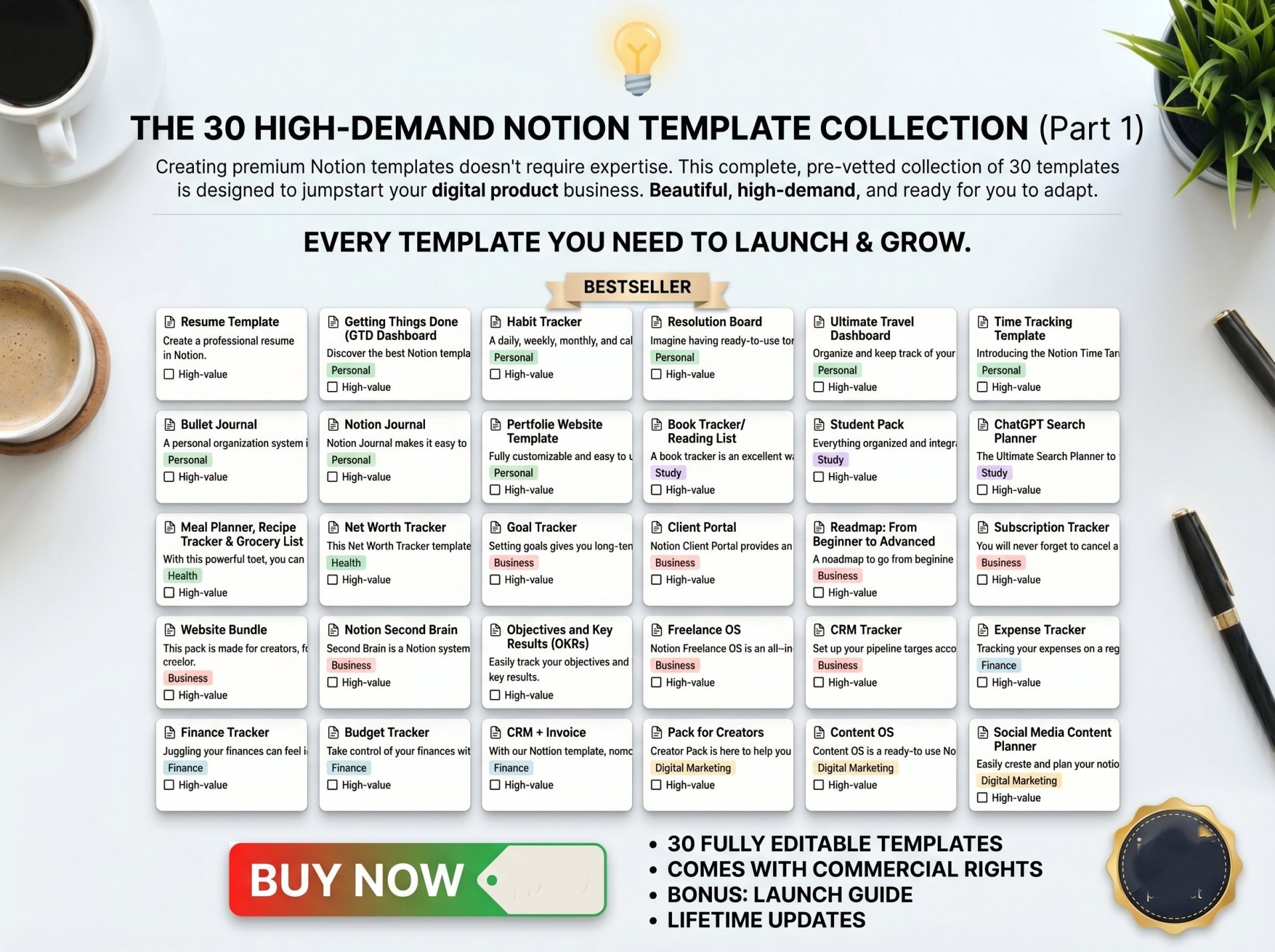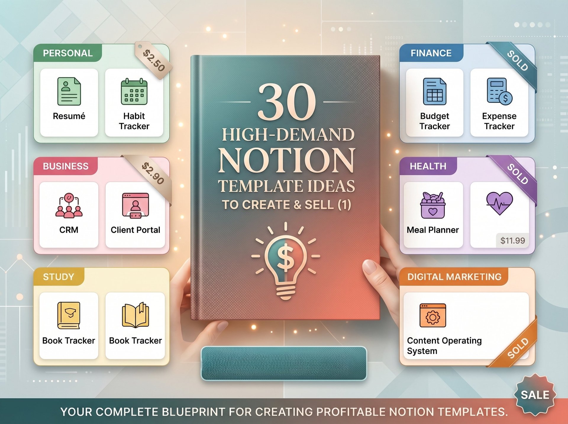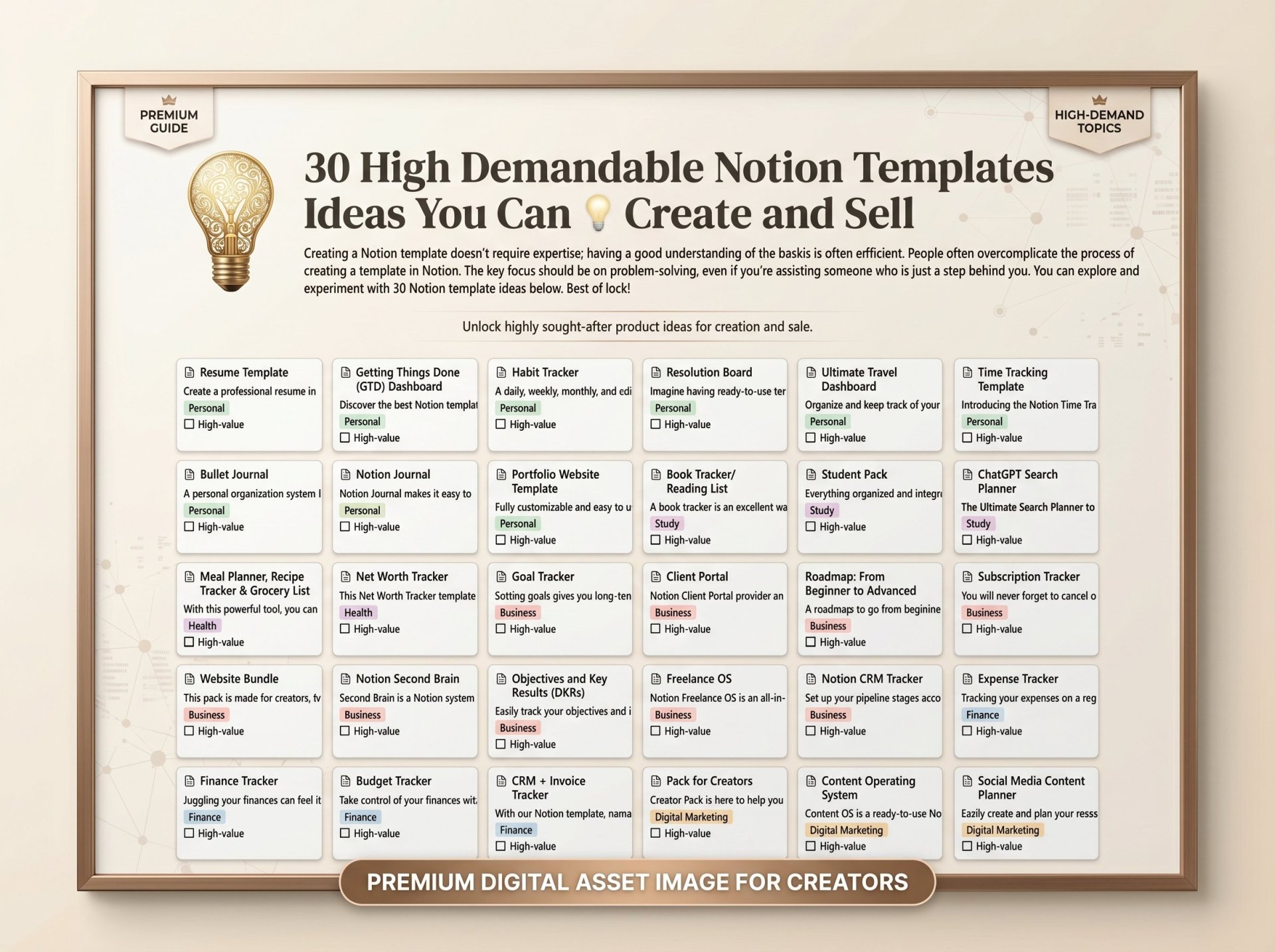 30 Profitable Concepts: A hand-picked list of high-demand template ideas spanning different niches (productivity, finance, life organization, etc.).